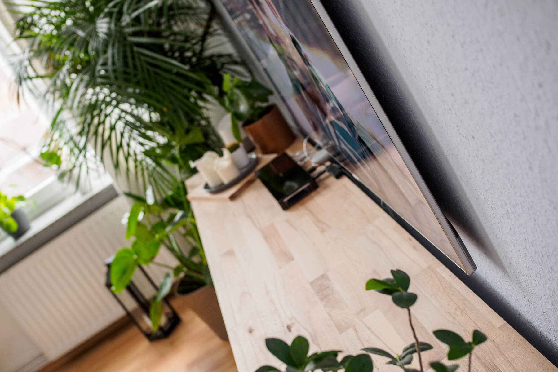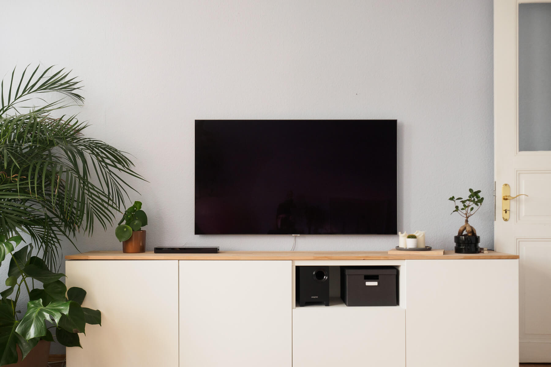 Selbst ausgeschaltet ist er einfach nur schön. Ohne das ganze Kabelgedöns wirkt die Ecke so viel aufgeräumter. Auf dem Sideboard steht nun auch kein TV-Fuß mehr und alles ist luftiger. Mir gefällt das sehr gut. Da ist ein sehr schönes Stück Design eingezogen, das mehr kann, als einfach nur hübsch auszusehen. Aber dazu dann an anderer Stelle mehr.